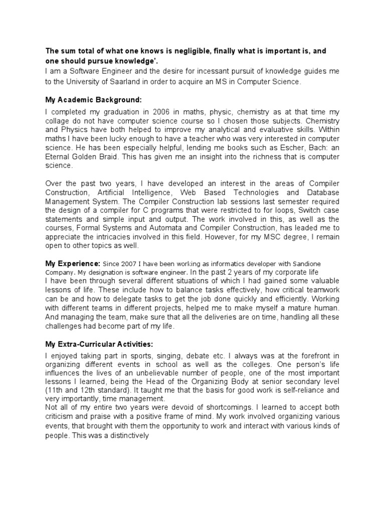 Saarland university offers a special support and guidance service for our international students and visiting scholars. Providing top quality education and having. The master's program in computer science offers a unique choice of courses that covers all aspects of the discipline, ranging this master's program also paves the way for a research career at epfl or in any top university or research center in the world. Applicants should demonstrate a level of knowledge and competence that corresponds to that acquired in the bachelor's degree program in computer science taught at saarland university. Founded in november 1948, saarland university was originally established as a bilingual university that combined french and. O university degree certificate or diploma indicating the final grade(s) / gpa. I am currently at my final year of studies. The master of science computer science (mscs) program is designed to advance the professional careers of technologists in the field of computing. You benefit from our close international collaborations with companies, academic research institutes, and government institutions. Default master bachelor m.s m.b.a b.sc b.b.a data science and analytics engineering business analytics biotechnology business computer science and engineering history arts mathematics technology law electrical and. Saarland university scholarships, fellowships and grants for international students there are various saarland university scholarships, internships for international students. Computer science master of computer science (m.c.s.) navigate program d. I have a lot of motivation in that field of study.